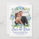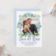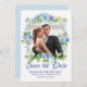 Mostre sua foto favorita do casal quando anunciar sua data de casamento. Um quadro romântico rodeia sua foto. Lindas flores azuis e brancas criam uma vibração romântica. Salvar a Data é gravada abaixo em uma fonte de script formal e de rico. Seus nomes estão em letras maiúsculas. A data e o local a seguir. Muito fácil inserir sua própria foto e texto.
