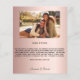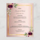 Na frente: Um elegante cartão de cardápio de boho boêmico. Penas e rosas de cor aquosa em burgundy. Personalize e adicione seus nomes, data e menu de casamento. Um quadro de ouro falso e um fundo metálico de rosa de ouro chic. Letras cinzas escuras coloridas. Volta: fundo rosa dourado, sua foto e adicione sua história de amor ou fatos divertidos. Dê às pessoas algo para falar enquanto espera que a comida seja servida!
