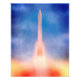 Um Foguete Espacial Prateado sobe e sobe para dentro dos céus azuis acima à medida que seus gases e fumos brancos laranja, vermelho e quente explodem lançando este míssil da sua plataforma de lançamento. Pintura do Spray pelo artista Jason Girard.