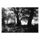 Imagem fotográfica de carvalhos antigos na borda de uma madeira velha em semisilhueta