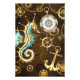 Fundo de madeira castanho com fundo marinho, cordilheira mecânica, volante antigo, âncora de ouro e diversas engrenagens de ouro e latão. Estilo Steampunk.
