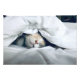 Esta impressão de fotografia de alta definição apresenta um lindo gato dormindo debaixo de um cobertor branco. Fotógrafo: Kate Stone Matheson.