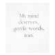A simple, minimalist design carrying a powerful message of self-compassion. The quote, "My mind deserves, gentle words, too." is rendered in an elegant, soothing serif font and a soft, muted grey color against a light neutral background. This graphic serves as a gentle reminder to practice self-kindness, challenge negative self-talk, and prioritize mental well-being. It is perfect for those who advocate for self-care, mindfulness, positive affirmations, and emotional health. An ideal design for a calming poster, apparel, or daily motivational item.
