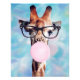 Girafa vestindo óculos e soprando uma bolha rosa de fundo azul molhado.