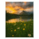 A breathtaking nature scene captured in golden hour light, featuring vibrant wildflowers in the foreground, a tranquil lake reflecting the sky, and majestic snow-capped mountains in the background. The dramatic clouds and warm sunset hues create a serene and inspiring atmosphere, making this image perfect for a that evokes peace and wonder.