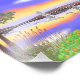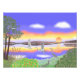 Cena de arte moderna e colorida. Um lago, céu azul e laranja, sol baixo, reflexões na água, e três Herões. Impressões de fotos, impressões de tela e cartas.