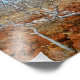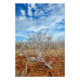 A paisagem da Ilha de Seymour do Norte, parte do Arquipélago das Galápagos. As rochas vermelhas enferrujadas ao redor da árvore branca branqueada pelo sol, apontando para o céu azul.