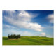 Foto impressão de um grupo de ciprestes numa paisagem com colinas verdes e flores amarelas sob lindas nuvens brancas perto de Torrenieri, no Vale de Órcia, na Toscana, Itália.
