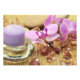 Orquídea roxa e vela com pedras de vidro e rochas grandes como um conceito de spa.