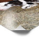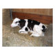 Foto de uma jovem vaca negra e branca deitada em feno