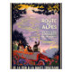 La route des Alpes Services automobiles de tourisme de la mer à la haute montagne. Poster de viagens para a França, que apresenta um guia turístico e turístico num torneio PLM (Compagnie des chemins de fer de Paris à Lyon et à la Méditerranée), com uma rota de Nice a Evian e para além dela.