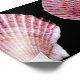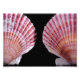 Uma fotografia viva de dois conchas cor-de-rosa, laranja e branca num fundo preto. Copyright ©Kimberly J Tilley.
