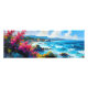 Grande praia e rochas mediterrânicas de paisagem. Uma aquarela estilizada cênica captura uma visão litorânea ampla com ondas azuis cortadas e uma praia arenosa curvando a distância. Baixas penhascos e grandes afloramentos rochosos enrolaram a praia, com montanhas distantes e flores em primeiro plano em pinks e amarelos acrescentando um toque tranquilo e colorido.