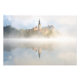 Foto impressão de um nascer do sol nebuloso no lago Bled com reflexo da ilha com a igreja na água do lago e com o Castelo Bled ao fundo num belo dia de outono na Eslovênia.