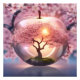 É apresentada uma maçã translúcida com uma macieira dentro com fundo de flores de macieira cor-de-rosa.