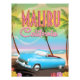 Viagens vintage de poster de um carro clássico antigo na Califórnia em Malibu, por uma bela praia.