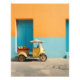 Feliz cena da rua de verão. Um pequeno riksja amarelo com frutas frescas de manga na parte de trás