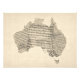 Um mapa da Austrália feito a partir de uma colagem de músicas antigas e antigas, incluindo algumas notas e pontuações escritas à mão, sobre um fundo antigo.