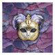 Uma máscara decorativa de prata adornada com detalhes intrincados de ouro se destaca contra um fundo roxo rachado. Placas de penas de lavanda acentuam a aparência real do design e do ornamentado da máscara