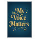 Esta poster é uma bela e inspiradora peça de arte projetada para capacitar. A poderosa frase "Minha Voz Importa" é exibida em uma elegante e brilhante inscrição em ouro, dando a ela uma sensação radiante e luxuosa. Símbolos dourados deliciosos estão espalhados ao fundo, adicionando um toque de ritmo e criatividade. Tudo isso é colocado sobre um fundo azul escuro sereno e profundo, uma cor muitas vezes associada a profundidade, sabedoria e estabilidade. Perfeito para um estúdio, quarto ou escritório doméstico, este poster serve como um lembrete na moda diário para falar sua verdade, expressar suas ideias e deixar sua voz única ser ouvida. É mais do que apenas decoração; é uma declaração de autoestima e uma celebração do seu poder. Faça seu pedido hoje mesmo