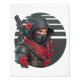 Esta é uma ilustração digital de um misterioso guerreiro ninja camuflado com espada e lenço vermelho. O rosto do guerreiro está escondido pelo capuz do manto, aumentando o mistério e a intriga. A espada tem uma pega preta e uma lâmina prateada, refletindo a luz. O fundo é um círculo de cinzas com flores e folhas vermelhas, criando um contraste entre o escuro e as cores brilhantes. Esta design é perfeita para fãs de fantasia, aventura e gêneros misteriosos.
