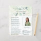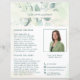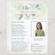 Folheto de negócios elegante com seu nome entre uma borda superior e inferior de folhas de eucalipto e verde com uma dica de azul, sobre uma lavagem a aquarela pastel. Use a modelo para adicionar sua foto e biografia. Este folheto de estilo rústico é excelente para um novo agente imobiliário/corretor de imóveis desmaiar como uma carta de introdução/agricultura.