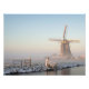 Foto de impressão de um moinho de vento na neve ao lado de um canal e uma cerca durante um nascer nebuloso no inverno na Holanda.