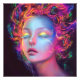 Esta trabalho de arte digital mesmerizante apresenta um retrato feminino brilhante com olhos fechados, cercado por cabelos radiantes e multicoloridos que se assemelham a nebulosas e galáxias. As matizes neon e a estética surreal evocam um mundo de sonho futurista, perfeito para amantes da fantasia, arte cibernética e design visionária. Uma peça cativante.