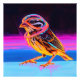 Uma ilustração néon marcante de um pardal adornada com anéis brilhantes e sotaques vibrantes, colocada contra um pano de fundo ousado de púrpuras, blues e pinks inspirados em ondas sintéticas. Este trabalho de arte retro-futurista de aves é perfeito para fãs de estética de ondas de vapor, arte digital brilhante e retratos de animais surreais.