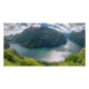 Foto impressão de todo o Geirangerfjord, um famoso fiorde na Noruega, terminando na pequena vila de Geiranger, vista do Bend de Eagle. Um fiorde é uma entrada de água entre as montanhas.