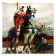 Um cavaleiro de armadura montado em um cavalo fica ao lado de um rio, segurando uma lança com uma expressão atenciosa. Perto, dois indivíduos sentam-se no chão, olhando para o cavaleiro com expressões de preocupação ou medo. Esta pintura é chamada "O Lancaster Vindo" de Howard Pyle.