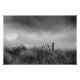 Foto em preto-e-branco do fim da cerca com um solteiro postado à direita da foto com um céu mais escuro e nublado e dunas em primeiro plano, Brancaster, Norfolk, Inglaterra