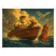 An old sailor and his trusty canine companion sailing choppy waters on their motor boat, this painting is fun colourful and exudes a feeling of movement and adventure