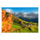 Foto impressão de uma igreja e de uma Rua da aldeia. Magdalena em Villnoess, numa paisagem de conto de fadas com montes majestosas de Dolomites ao fundo e folhas em cores de outono no Vale de Val di Funes, na Itália.