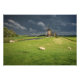 Foto impressão de algumas ovelhas na grama verde em frente a três moinhos de vento sob um céu escuro com nuvens de chuva pouco antes de uma tempestade de primavera num cenário em Leidschendam, Países Baixos.
