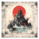 Paisagem chinesa com casa pequena em colina alta e sol grande e vermelho