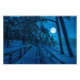 Paisagem de inverno com pinheiro e abetos cobertos de neve em lua à noite estrelada com lua de cheio. Vista de uma floresta de coníferas com uma via de madeira perto da costa marítima com belo céu noturno com estrelas