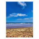 Uma bela cena de praia com céus claros e azuis, ondas suaves e uma costa arenosa. Ideal para transmitir tranquilidade, relaxamento e a beleza da natureza.