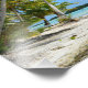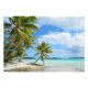 Foto impressão de uma palmeira pendurada em uma praia de areia branca em uma pequena ilha deserta na lagoa azul de Rangiroa tropical, um atol próximo a Bora Bora no arquipélago francês do Taiti na Polinésia Francesa no oceano Pacífico.