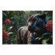 Pantera Negra - Jaguar melanístico na selva verde com flores vermelhas Arte AI por minx267