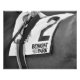 A icônica seleta negra e branca #2 com o famoso logotipo do Belmont Park enfeita esta foto branca preta do pote "Jogos de inverno no lindo Belmont Park. Jockey Saddle e ferros estão no lugar nesses enormes momentos de luz antes que os cavaleiros sejam chamados. Fleetphotoname