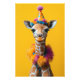 Uma girafa de bebê encantadora vestida para comemorar, vestindo um chapéu festivo com padrões coloridos e decorações fofinhas. A girafa estiva uma jiboia de penas multicolorida e fluída, e se posiciona contra um fundo amarelo brilhante, criando uma cena alegre e caprichosa.