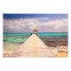 O calçadão de uma doca conduzindo a uma palapa no telhado gazebo e as águas coloridas esmeraldas do Mar Caribe, em Playa del Carmen, México, na Riviera Maia