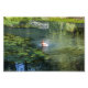 Pato tremendo numa lagoa verde, com belos reflexos das árvores e uma pequena ponte branca.