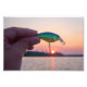 Um pescador masculino segurando uma pequena isca que prendia um sol em um lago na Finlândia Ocidental, impressão de fotos.