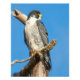 Um falcão peregrino empoleirado em um galho de árvore morto contra um céu azul vívido.