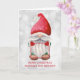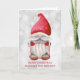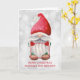 Um belo cartão de Natal com uma foto e um gnomo de aquarela com um chapéu vermelho. Na dentro do cartão está uma mensagem de Natal