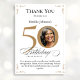 Foto personalizada Dourada 50º Cartões de agradecimentos de aniversário. Um cartões de agradecimentos especial de celebração de aniversário, elegantemente projetado, com uma foto personalizada de pessoa de aniversário e caligrafia de script com elementos florescentes de vintage. Simples o suficiente para ajustado de uma variedade de temas e cores! Precisa de ajuda com o modelo? Basta entrar em contato comigo!