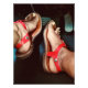 Retro 1970, vermelho e ouro abraçando seus pés delicados e ebony.