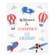 Blue How Time Flies Plane primeiro aniversario Welcome Sign Blue, vermelho com um toque de amarelo como o tempo voa primeiro sinal de boas-vindas de aniversário para um bebê apresentando alguns aviões, balões de ar quente e nuvens.